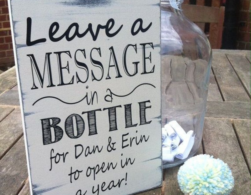 Zet een grote glazen fles neer. Maak kleine briefjes, waarop een leuk berichtje of een huwelijkstip kan worden geschreven. Laat de boodschap oprollen en bind deze vast met een touwtje en doe deze in de fles. Een leuk aandenken voor het bruidspaar om het komende jaar nog eens door te lezen.
